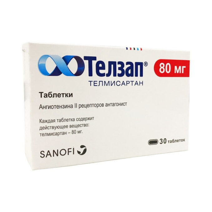 Таблетки беловато — желтоватого цвета, продолговатые, с двояковыпуклой поверхностью и риской с двух сторон (для дозировки 40 мг), с маркировкой «80» на одной стороне (для дозировки 80 мг) | Состав+1 таблетка содержиттелмисартан — 40 или 80 мг соответственно | Противопоказания+- гиперчувствительность к телмисартану или к любому из компонентов- беременность и период лактации- нарушения проходимости желчевыводящих протоков- нарушение функции печени- наследственная непереносимость фруктозы- детский и подростковый возраст до 18 лет. | Побочные действия+Нечасто- инфекция верхних дыхательных путей, включая фарингит и синусит, одышка, кашель- инфекция мочевыделительных путей, включая цистит, нарушение функции почек, включая острую почечную недостаточность- анемия, гиперкалиемия, повышенный уровень креатинина в крови- депрессия, бессонница, головокружение, тревога, синкопе, зрительные нарушения, боль в груди, астения (слабость)- брадикардия, гипотензия, ортостатическая гипотензия- боль в брюшной полости, диарея, диспепсия, метеоризм, рвота, тошнота, сухость во рту- гипергидроз, зуд, сыпь, миалгия, боли в спине (напр., ишиас), мышечные спазмы ногРедко- тромбоцитопения, эозинофилия, повышенный уровень мочевой кислоты в крови, повышенный уровень печеночных ферментов, повышенный уровень фосфокиназы креатина в крови, снижение уровня гемоглобина- тахикардия- ощущение дискомфорта в желудке, нарушение функции печени- эритема, ангионевротический отек вплоть до летальных исходов, высыпания на коже, токсические высыпания на коже, экзема- артралгия, боли в конечностях и пояснице, беспокойство- гриппоподобные симптомыОчень редко- сепсис, включая летальный исход1- уртикария- боли в сухожилиях (симптомы, схожие с тендинитом)1В исследовании PRoFESSl, при приеме телмисартана наблюдался случай сепсиса, по сравнению с плацебо. Данное заболевание могло иметь случайное происхождение или могло быть вызвано неизвестным в настоящее время механизмом | Способ применения+Лечение артериальной гипертензии:Обычно эффективная доза составляет 40 мг один раз в день. Некоторым пациентам может помочь суточная доза в 20 мг. Прием дозы в 20 мг можно получить, разделив таблетку в 40 мг вдоль разделительной линии. Если нужное кровяное давление не установилось, дозу телмисартана можно увеличить максимум до 80 мг раз в день. В качестве альтернативы, телмисартан можно принимать вместе с диуретиками тиазидного типа, как гидрохлоротиазид, которые оказывают снижающее действие на кровяное давление вместе с телмисартаном. Если вы хотите увеличить дозу, нужно помнить, что максимальный антигипертензивный эффект достигается через четыре-восемь недель после начала приема препарата.Профилактика сердечнососудистых заболеванийРекомендуемая доза составляет 80 мг один раз в день.В начале приема телмисартана для профилактики сердечно-сосудистых заболеваний рекомендуется пристальный мониторинг кровяного давления.Печеночная недостаточностьУ пациентов с легкой или умеренной недостаточностью печени доза не должна превышать 40 мг один раз в день. | Показания к применению+- лечение артериальной гипертензии у взрослых- выраженные атеросклеротические сердечнососудистые заболевания (в анамнезе коронарная болезнь сердца, нарушение мозгового кровообращения или заболевание периферических ар
