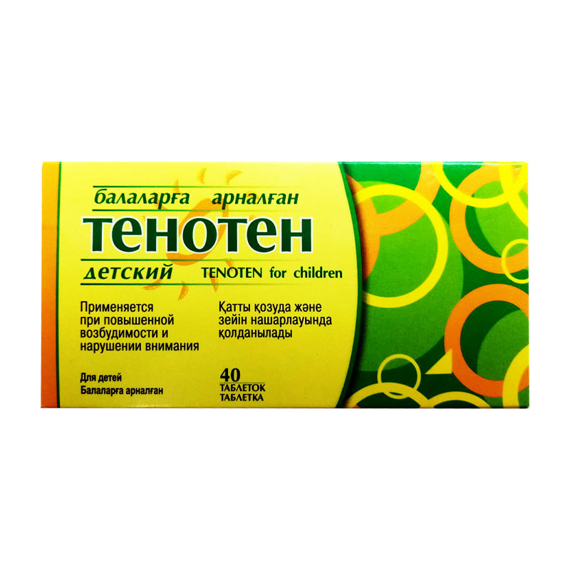 Таблетки плоскоцилиндрической формы, с риской и фаской, от белого до почти белого цвета. На плоской стороне с риской нанесена надпись MATERIA MEDICA, на другой плоской стороне нанесена надпись TENOTEN KID. | Состав+Одна таблетка содержит:антитела к мозгоспецифическому белку S-100 аффинно очищенные: смесь гомеопатических разведений С12, С30 и С50 — 0,003 г | Противопоказания+- повышенная индивидуальная чувствительность к компонентам препарата- детский возраст до 3-х лет | Побочные действия+- возможны реакции повышенной индивидуальной чувствительности к компонентам препарата | Способ применения+Детям старше 3-х лет на один приём — 1 таблетку (держать во рту до полного растворения), вне связи с приемом пищи. При необходимости таблетку можно предварительно растворить в небольшом количестве кипяченой воды комнатной температуры.В зависимости от тяжести состояния принимать по 1 таблетке 1-3 раза в сутки в течение — 1-3 месяцев. При необходимости курс лечения можно продлить до 6 месяцев или повторить через 1-2 месяца. | Показания к применению+- невротические и неврозоподобные расстройства, в том числе связанные со стрессовыми ситуациями с проявлениями тревоги, снижением настроения- умеренно выраженные функциональные и органические поражения ЦНС, сопровождающиеся неустойчивостью эмоционального фона, раздражительностью, апатией, снижением памяти, повышенной утомляемостью, расстройством внимания, вегетативными или двигательными нарушениями. | Артикул: A02-0001888