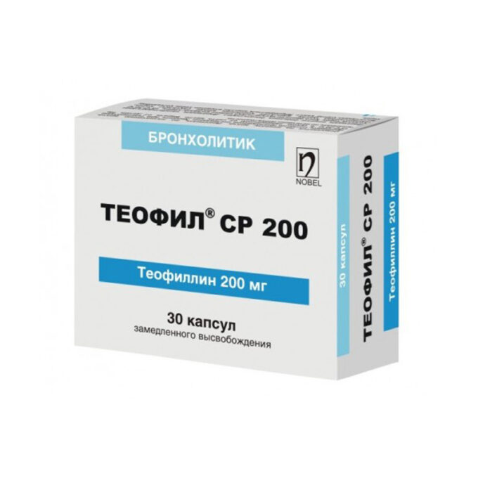 Твердые желатиновые капсулы, корпус капсул бесцветный и прозрачный, крышечки прозрачные розового цвета (100 мг), тёмно-синего цвета (200 мг), зе-лёного цвета (300 мг). Каждая капсула содержит сферические микропеллеты белого или беловатого цвета. | Состав+Одна капсула содержиттеофиллин 100 мг, 200 мг, 300 мг | Противопоказания+- гиперчувствительность к теофиллину или к компонентам препарата- эпилепсия и другие судорожные состояния- гиперфункция щитовидной железы- острый инфаркт миокарда- субаортальный стеноз- экстрасистолия- язвенная болезнь желудка и двенадцатиперстной кишки в фазе обострения- детский возраст до 6 лет- беременность. | Побочные действия+- изжога, тошнота, рвота, боли в эпигастрии, диарея- головная боль, раздражительность, беспокойство, бессонница, повышенная рефлекторная возбудимость, клонические и тонические судороги- сердцебиение, тахикардия, экстрасистолия, приливы крови, гипотензия, на-рушение кровообращения, желудочковая аритмия- тахипноэ- увеличение диуреза- алопеция, гипергликемия, гипокалиемия, зуд, сыпь | Способ применения+Препарат применяют перорально. Режим дозирования устанавливаются инди-видуально.Для взрослых:Разовая доза- 200 мг — 300 мг; суточная доза- 400 мг — 600 мг. Максимальная разовая доза- 400 мг; максимальная суточная доза- 600 мгДля детей старше 6 лет:Разовая доза- 100 мг; суточная доза- 200 мг. Максимальная разовая доза-200 мг; максимальная суточная доза- 400 мг.Если улучшения состояния не наблюдается, то доза может быть увеличена примерно на 25% каждые 3 дня в течение времени пока препарат хорошо переносится.Увеличение дозы должно производиться до максимальных доз, указанных ни-же:Возраст Дозировка6-9 лет: 24 мг/кг в день9-12 лет: 20 мг/кг в день12-16 лет: 18 мг/кг в день16 лет и старше: 13 мг/кг в день или по 900 мг в деньТак как теофиллин не попадает в жировые ткани, следует строго определять до-зу по массе.Эффективное использование теофиллина (концентрация препарата в сыворотке зависит от оптимальной пользы и минимального риска интоксикации) достига-ется при концентрации теофиллина в сыворотке от 10 до 20 мкг/мл.Капсулы проглатывать целиком, не вскрывая и не разжевывая. | Показания к применению+- бронхиальная астма- симтоматическое лечение бронхоспазма различной этиологии (в т.ч. при хро-нических обструктивных болезнях легких, хроническом бронхите, эмфиземе легких)- легочная гипертензия- легочное сердце- расстройство дыхания по типу Чейна-Стокса- нарушение мозгового кровообращения. | МНН: Теофиллин эфедринОбъем: 200 мгАртикул: A01-0001395
