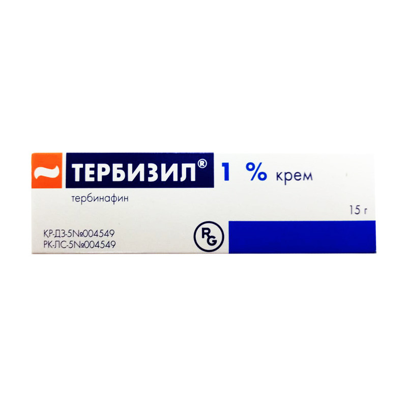 Крем белого или почти белого цвета с легким запахом миндаля, легко смываемый водой. | Состав+1 г крема содержиттербинафина гидрохлорид 10 мг | Противопоказания+- повышенная чувствительность к действующему веществу или к любому из вспомогательных веществ- беременность и период лактации- детский возраст до 12 лет | Побочные действия+Очень частые (больше или равно 1/10)- раздражение в месте нанесенияЧастые (больше или равно 1/100 до ‹1/10)- зуд, жжение, боль, покраснение в месте нанесения, контактный дерматит- аллергические реакции в виде крапивницыОбычно не возникает необходимости прерывать лечение, но при развитии аллергической реакции в месте нанесения, необходима отмена лечения. | Способ применения+Крем Тербизил® можно использовать у взрослых и детей старше 12 лет.Длительность лечения зависит от показаний и тяжести инфекции.Крем следует наносить тонким слоем 1 -2 раза в день на пораженную кожу и окружающую область, предварительно вымытую и высушенную, слегка втирать. При инфекциях, сопровождающихся опрелостями (под грудью, между пальцами, в межягодичной области, в паховой области) на место применения можно наложить марлю, особенно на ночь.Кратность и длительность лечения:Грибковые поражения кожи тела, паха (трихофития гладкой кожи, эпидермофития паха) — 1 раз в день 1 неделюМикоз стоп (эпидермофития стоп) — 1раз в день 1 неделюКандидоз кожи — 1-2 раза в день 1 неделюОтрубевидный лишай -1-2 раза в день 2 неделиПозитивная динамика клинических симптомов при грибковой инфекции наступает в течение нескольких дней от начала терапии и (подтверждается микологическим исследованием). Нерегулярное использование и/или преждевременное прекращение лечения могут привести к рецидиву.Если улучшение не наступает в течение двух недель от начала лечения, следует проверить правильность поставленного диагноза.Использование у лиц пожилого возрастаНет данных, предполагающих, что для пациентов пожилого возраста требуются другие схемы дозирования, или что у них наблюдаются другие побочные эффекты, по сравнению с более молодыми пациентами. | Показания к применению+- онихомикозы и микозы кожи, вызванные дерматофитами (Trichophyton например, T. rubrum, T. mentagrophytes, T. verrucosum, T. violaceum, Microsporum например, M. canis, M. gypseum и Epidermophyton floccosum)- инфекции кожи, вызванные дрожжевыми грибами, рода Candida- отрубевидный лишай, вызванный Malassezia furfur | МНН: ТербинафинОбъем: 1%Артикул: A02-0001504