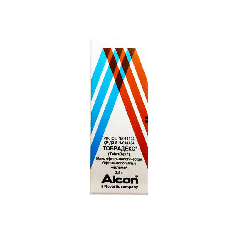 Гомогенная мазь от белого до почти белого цвета. | Состав+1мл содержит:тобрамицин 3,0мг; дексаметазон 1,0мг | Противопоказания+- повышенная чувствительность к любому компоненту препарата- кератит, вызванный возбудителем герпеса Herpes simplex- микобактериальная инфекция глаз- коровья оспа- ветряная оспа- грибковые заболевания глаз- острые гнойные заболевания глаз- лактация.Применение Тобрадекса® не рекомендуется после не осложненного удаления инородного тела из роговицы и при любых других инфекциях или повреждениях поверхности эпителия роговицы. | Побочные действия+Местные:- зуд- отек век или конъюнктивы- гиперемия конъюнктивы- конъюнктивальная эритема- расширение зрачка- ощущение инородного тела в глазу- затуманивание зрения, преходящий дискомфортПри всасывании в редких случаях могут отмечаться:- повышение внутриглазного давления с последующим развитием глаукомы, поражения зрительного нерва и поля зрения, образование задней субкапсулярной катаракты.- замедление процесса заживления ран (при заболеваниях, вызывающих утончение роговицы или склеры, возможно прободение фиброзной оболочки при местном применении стероидных препаратов).- развитие вторичной инфекции, грибковое поражение роговицы при длительном применении стероидов. | Способ применения+Полоска мази длиной 1,5 см в конъюнктивальный мешок, 3- 4 раза в день.Можно сочетать применение мази и капель: мазь — вечером перед сном, капли — в течение дня.Применение глазной мази Тобрадекс® у детей так же эффективно и безопасно, как и при использовании препарата у взрослых и может назначаться в такой же дозе как и для взрослых пациентов.Не следует прекращать лечение преждевременно.Не следует прикасаться кончиком наконечника тубы к глазам или любой другой поверхности, чтобы избежать загрязнения содержимого тубы.После нанесения препарата рекомендуется прижатие носослезного канала или прикрытие век. Это снижает системное всасывание и неблагоприятное воздействие лекарственного препарата, применяющегося местно через ткани глаза. | Показания к применению+Инфекции глаза и его придатков:- блефарит;- конъюнктивит;- кератит (без повреждения эпителия);Профилактика послеоперационных инфекционных осложнений в офтальмологии. | Артикул: A01-0001412
