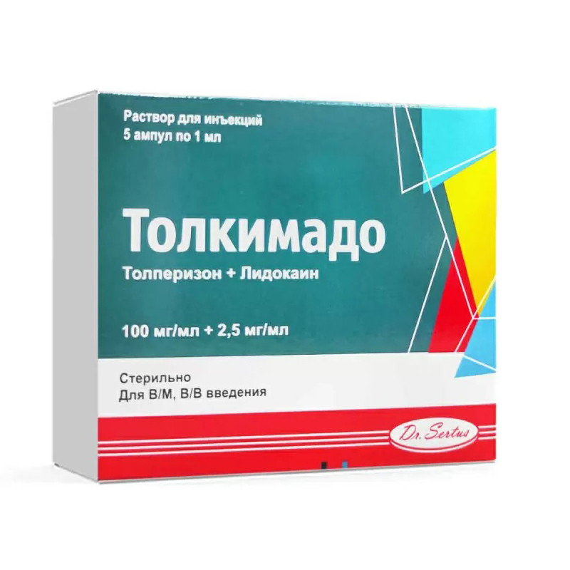 Прозрачный бесцветный раствор. | Состав+Одна ампула препарата содержиттолперизона гидрохлорид 100 мг, лидокаина гидрохлорид 2.5 мг | Противопоказания+Гиперчувствительность к толперизону или другим аналогичным химическим веществам (эперизон), а также к вспомогательным компонентам (в том числе лидокаин)тяжелая миастениядетский возраст до 18 летлактациябеременность | Побочные действия+Параметры частоты нежелательных реакций определяются следующим образом: очень часто (больше или равно 1/10); часто (больше или равно 1/100, но ‹ 1/10); нечасто (больше или равно 1/1000, но ‹ 1/100); редко (больше или равно1/10000, но ‹ 1/1000); очень редко (‹ 1/10000); частота неизвестна (не может быть оценена по имеющимся данным).Со стороны крови и лимфатической системы: очень редко — анемия, лимфаденопатия.Со стороны иммунной системы: редко — реакция гиперчувствительности, анафилактическая реакция; очень редко — анафилактический шок.Со стороны обмена веществ и питания: нечасто — анорексия; очень редко — полидипсия.Нарушения психики: нечасто — бессонница, нарушение сна; редко — снижение активности, депрессия.Со стороны нервной системы: нечасто — головная боль, головокружение, сонливость; редко — нарушение внимания, тремор, судороги, пониженная чувствительность, парестезия, патологическое оцепенение; очень редко — спутанность сознания.Со стороны органа зрения: редко — затуманивание зрения.Со стороны органов слуха и равновесия: редко — шум в ушах, головокружение.Со стороны сердца: редко — стенокардия, тахикардия, ощущение сердцебиения; очень редко — брадикардия.Со стороны сосудов: нечасто — артериальная гипотензия; редко — патологический румянец.Со стороны дыхательной системы, органов грудной клетки и средостения: редко — диспноэ, носовое кровотечение, тахипноэ.Со стороны желудочно-кишечного тракта: нечасто — дискомфорт в животе, диарея, сухость во рту, диспепсия, тошнота; редко — боль в эпигастрии, запор, метеоризм, рвота.Со стороны печени и желчевыводящих путей: редко — легкие нарушения со стороны печени.Со стороны кожи и подкожных тканей: редко — аллергический дерматит, усиленная потливость, зуд, крапивница, высыпания.Со стороны почек и мочевыводящих путей: редко — энурез, протеинурия.Со стороны скелетно-мышечной и соединительной ткани: нечасто — мышечная слабость, миалгия, боль в конечностях; редко — дискомфорт в конечностях; очень редко — остеопения.Общие расстройства и нарушения в месте введения: нечасто — астения, недомогание, утомляемость; редко — ощущение опьянения, ощущение жара, раздражительность, жажда; очень редко — дискомфорт в грудной клетке.Влияние на результаты лабораторных и инструментальных исследований: редко — снижение артериального давления, повышение концентрации билирубина в крови, изменение активности печеночных ферментов, снижение числа тромбоцитов, повышение числа лейкоцитов; очень редко — повышение содержания креатинина в крови. | Способ применения+Препарат Толкимадо предназначен для внутримышечного и внутривенного введения.Взрослым назначают внутримышечно по 1 мл 2 раза в сутки, внутривенно медленно — 1 мл 1 раз в сутки. | Показания к применению+Гипертонус и спазм поперечнополосатой мускулатуры, возникающие вследствие органических заболеваний ЦНС (в т.ч. поражение пирамидных путей, рассеянный склероз, инсульт, миелоп