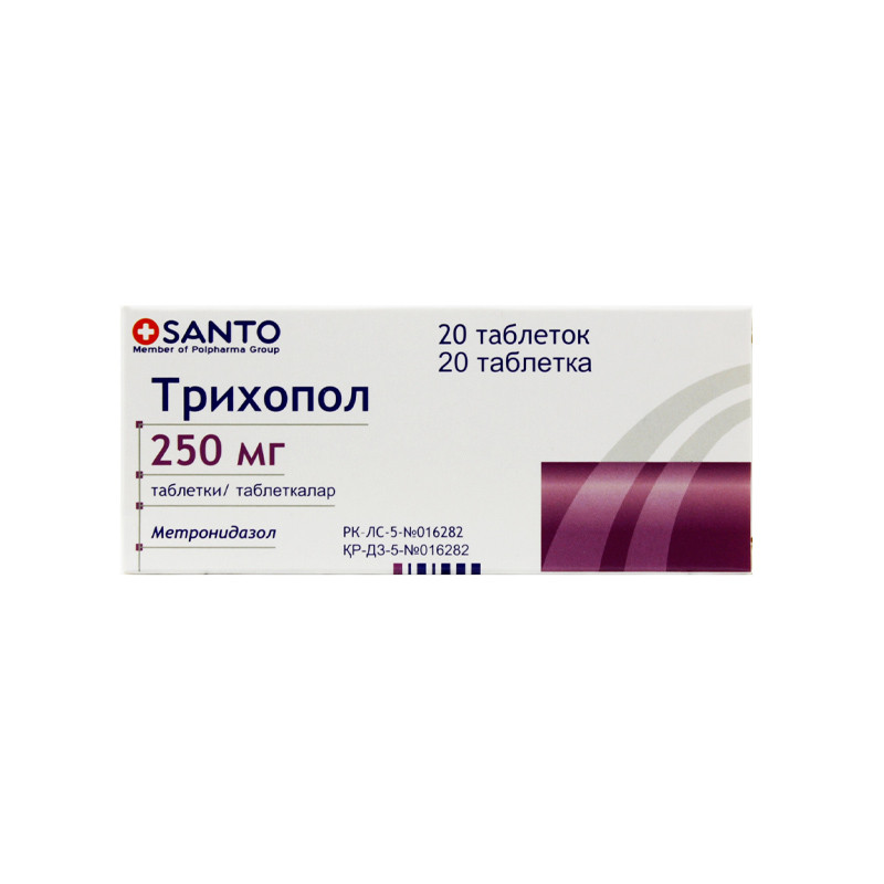 Таблетки белого цвета с желтоватым оттенком, желтеют под действием света, круглые, плоские с обеих сторон и риской на одной стороне. | Состав+Одна таблетка содержитметронидазол 250 мг | Противопоказания+- гиперчувствительность к компонентам препарата или к другим производным 5 — нитроимидазола- органические поражения ЦНС (эпилепсия, шизофрения)- тяжелая печеночная недостаточность (в том числе печеночная энцефалопатия)- выраженная лейкопения (в том числе в анамнезе)- беременность I триместр- детский возраст до 6 лет | Побочные действия+Часто (›1/10, ‹100)- металлический привкус во рту, обложенный язык, тошнота, рвота, чувство дискомфорта в животе, диареяРедко (›1/10 000, ‹1/1 000)- анафилаксия, полиморфная эритема, кожные высыпания, зуд, крапивница, ангионевротический отек- периферическая нейропатия, проявляющаяся онемением, парестезиями (чувство ползания мурашек), в большинстве случаев исчезающие после отмены препарата или снижения дозы; головная боль, головокружение, слабость, сонливость, бессонница, обморок, эпилептиформный припадок, энцефалопатия, мозжечковый синдром (атаксия, скандированная речь, нарушение координации движений, нистагм, тремор), психические нарушения, дезориентация, нервозность, депрессия, галлюцинации- диплопия, близорукость, светофобия- шум в ушах, потеря слуха- сухость во рту, стоматит, острый панкреатит, проходящий после отмены препаратаОчень редко (‹1/10 000)- изменения показателей ферментативной системы печени, холестатический гепатит и желтуха, проходящие после отмены препарата- умеренная, транзиторная лейкопения, панцитопения, часто исчезающая после отмены препарата- миалгия, артралгия- темное окрашивание мочи, вызванное наличием хорошо растворимых красителей в воде, появившихся в результате биотрансформации метронидазола- болевые ощущения во влагалище, грибковые инфекцииВ единичных случаях- аплазия костного мозга | Способ применения+Профилактика инфекций, вызванных анаэробными бактериямиВзрослые и дети старше 12 лет: в начале лечения по 1 г (4 таблетки по 250 мг) однократно, затем по 1 таблетке 250 мг 3 раза в сутки во время или после еды, до периода непосредственной подготовки пациента к операции.Детям в возрасте 6 -12 лет: по 125 мг каждые 8 часов в течение 2 дней.Лечение инфекций, вызванных анаэробными бактериямиТрихопол® применяют в монотерапии или в сочетании с другими противобактериальными средствами. Обычно курс лечения не превышает 7 дней.Взрослые и дети старше 12 лет: по 1-2 таблетки 250 мг назначают 3 раза в сутки во время или после еды.Детям 6 — 12 лет назначают дозу из расчета 7,5 мг/кг массы тела 3 раза в сутки во время или после еды.ТрихомониазОбязательно лечение обоих партнеров.Женщинам назначают по 250 мг (1 таблетка 250 мг) 2 раза в сутки утром и вечером во время приема пищи в течение 10 дней, при повторном курсе по 750- 1,0 г 2 раза в день в течение 2 — 3 дней. Также назначают по 2 г Трихопола® однократно.Мужчинам назначают по 250 мг (1 таблетка 250 мг) 2 раза в сутки утром и вечером во время приема пищи в течение 10 дней или по 750 мг или 1 г 2 раза в течение 2 — 3 дней. Также назначают по 2 г Трихопола® однократно.Детям с 6 лет до 12 лет — дозу из расчета 35-50 мг/кг массы тела/сутки в 2 приема, в течение 3 дней.Бактериальный вагинитВзрослым по 500 мг (2 таблетки по 250 мг) утром и вечером в течение 7 дней или 2 г Трихопола® однократно.АмебиазВзросл