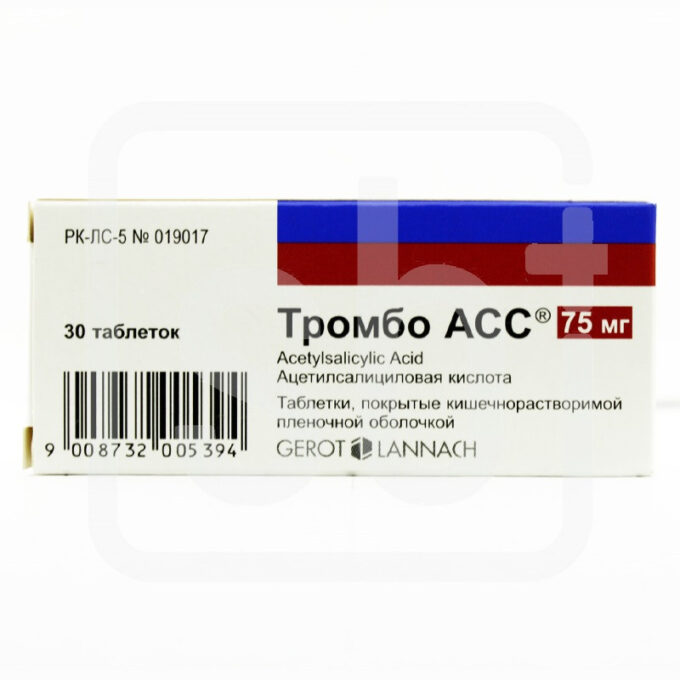 Белые, круглые, двояковыпуклые таблетки с пленочным покрытием, поверхность таблетки гладкая или слегка шероховатая, блестящая. | Состав+Одна таблетка содержитацетилсалициловая кислота 0,05 г (50 мг), 0,075 (75 мг) и 0,1 г (100 мг) | Противопоказания+- повышенная чувствительность к салициловой кислоте и ее производным- эрозивно-язвенные поражения желудочно-кишечного тракта в стадии обострения- повышенная кровоточивость, нарушение свертываемости крови, гемофилия- нефролитиаз- «аспириновая» астма- гипопротромбинемия- дефицит глюкозо-6-фосфатдегидрогеназы- период лактации- детский возраст до 12 лет из-за возможности возникновения синдрома Рея, очень редкого, но потенциально опасного для жизни состояния, требующего оказания немедленной медицинской помощи. | Побочные действия+Тромбо АСС вследствие низкой дозировки ацетилсалициловой кислоты и наличия кишечнорастворимой оболочки, очень хорошо переносится больными, однако в исключительных случаях могут встречаться следующие нежелательные эффекты:- реакции повышенной чувствительности (спастическое дыхание, кожные проявления)- нарушения со стороны желудочно-кишечного тракта (тошнота, рвота, диарея)- скрытые желудочно-кишечные кровотечения, способные привести к железодефицитной анемии- удлинение менструального цикла- провокация приступов бронхиальной астмы- тромбоцитопения- при длительной терапии высокими дозами препарата возможны нарушения со стороны почек, головокружение, звон в ушах, язвы желудочно-кишечного тракта, кровотечение. | Способ применения+Таблетки Тромбо АСС, покрытые кишечнорастворимой пленочной оболочкой, следует принимать внутрь, не ломая и не разжевывая, запивая небольшим количеством жидкости. Рекомендуемая доза при вышеперечисленных показаниях составляет 50, 75, 100 мг один раз в день. У пожилых больных коррекция дозы не требуется. Детям после 12 лет с дезагрегантной целью из расчета 1 мг/кг массы тела. | Показания к применению+- первичная и вторичная профилактика инфаркта миокарда- снижение риска инфаркта миокарда среди больных ишемической болезнью сердца- профилактика нарушений мозгового кровообращения по ишемическому типу- профилактика тромбозов и эмболии, в том числе у пациентов с повышенным риском их возникновения (после операций на сердце и сосудах, аортокоронарного шунтирования). | МНН: Ацетилсалициловая кислотаОбъем: 75 мгАртикул: A01-0001429