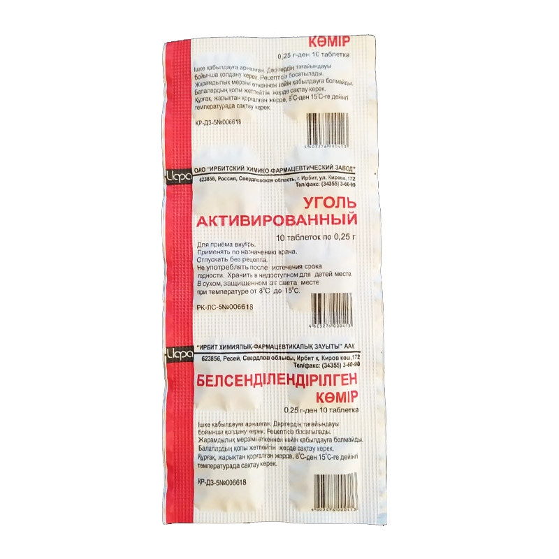 Таблетки черного цвета, плоскоцилиндрические, слегка шероховатые, с риской и фаской. | Состав+Одна таблетка содержитактивированный уголь 250 мг | Противопоказания+- обострение язвенной болезни желудка и двенадцатиперстной кишки- неспецифический язвенный колит- кровотечение из желудочно-кишечного тракта- атония кишечника- индивидуальная непереносимость препарата | Побочные действия+- запор- диареяПри длительном приеме (более 14 дней)- возможно нарушение всасывания кальция, витаминов. | Способ применения+Уголь активированный применяют внутрь в таблетках или, после предварительного измельчения, в виде водной взвеси, за час до еды и приема других лекарственных средств.Режим дозирования взрослым в среднем 1-2 г 3-4 раза в сутки, максимальная разовая доза — до 8 г. Детям препарат назначается в среднем из расчета 0,05 г/кг 3 раза в сутки в зависимости от массы тела, максимальная разовая доза — до 0,2 г/кг массы тела. Курс лечения при острых заболеваниях — 3-5 дней, при аллергии и хронических заболеваниях — до 14 дней. Повторный курс через 2 недели по рекомендации врача.При остром отравлении лечение начинают с промывания желудка с использованием взвеси угля активированного, затем дают внутрь 20-30 г препарата. При метеоризме назначают внутрь по 1-2 г препарата 3-4 раза в сутки. Курс лечения 3-7 дней. | Показания к применению+- применяется в качестве детоксицирующего средства при экзогенных и эндогенных токсикозах различной природы- в комплексном лечении пищевой токсикоинфекции, сальмонеллеза, дизентерии- при отравлении лекарственными препаратами (психотропными, снотворными, наркотическими средствами и др.), алкалоидами, солями тяжелых металлов и другими ядами- при заболеваниях желудочно-кишечного тракта, сопровождающихся диспепсией, метеоризмом- при пищевой и лекарственной аллергии- при гипербилирубинемии (вирусный гепатит и другие желтухи) и гиперазотемии (почечная недостаточность)- для уменьшения газообразования в кишечнике перед ультразвуковым и рентгенологическим исследованием | МНН: Активированный угольОбъем:
