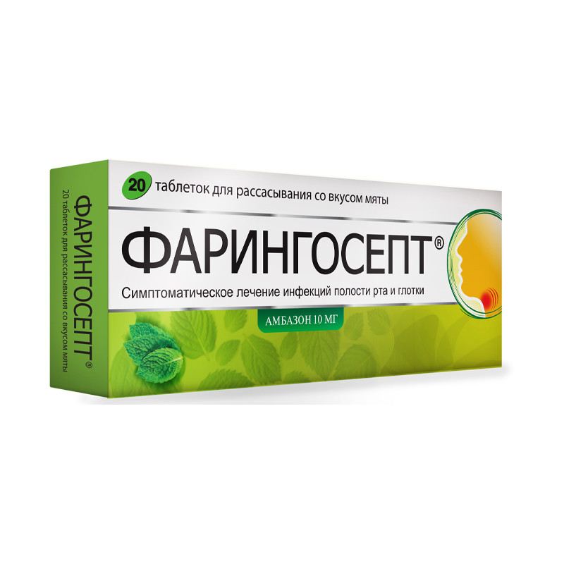 Твердые таблетки цилиндрической формы, коричневого цвета, с цельными краями, с плоской гладкой пигментированной поверхностью, с надписью «М» на одной стороне | Состав+Одна таблетка содержитамбазона моногидрат 10 мг | Противопоказания+- Повышенная чувствительность к амбазону или любому компоненту препарата- детский возраст до 14 лет | Побочные действия+- Возможно в случае гиперчувствительности- зуд, кожная сыпь, отек Квинке,крапивница- окрашивание слюны (единичный случай) | Способ применения+Взрослым — по 3-5 таблеток (30-50 мг) в сутки, в течение 3-4 днейДетям от 14 до 18 лет по 1 таблетке в сутки. Курс лечения — 3-4 дня. Таблетки Фарингосепта не проглатывают, а держат во рту до полного рассасывания. Препарат применяют сразу после еды (через 15-30 минут), рекомендуется воздержаться от еды и питья в течение 2-3 часов после приема препарата | Показания к применению+В составе комплексной терапии для острых инфекционно-воспалительных заболеваний полости рта и гортани- гингивит, стоматит, ангина, фарингит, тонзиллит- после тонзилэктомии и экстракции зубов | МНН: АмбазонОбъем: