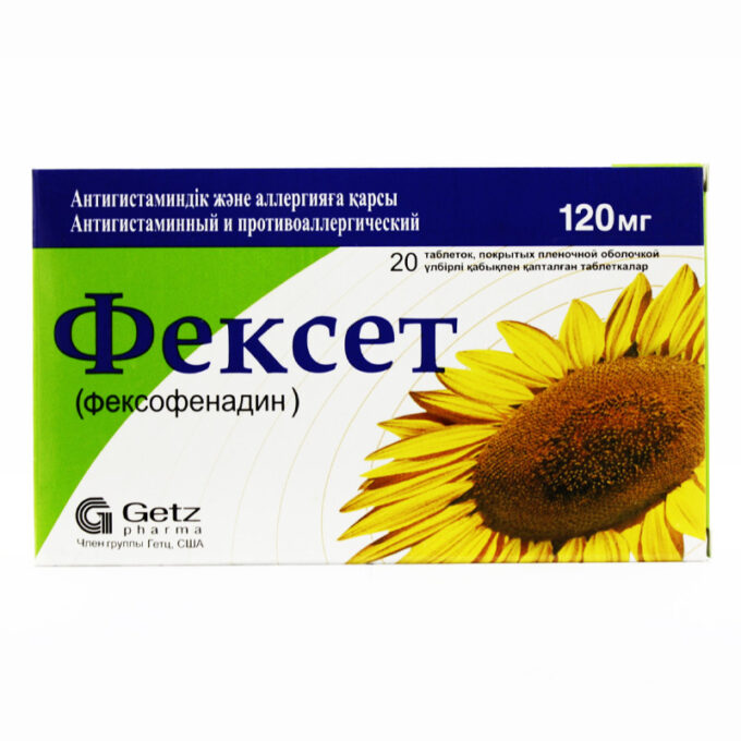Таблетки Фексет 60 мг: продолговатые покрытые пленочной оболочкой таблетки белого цвета с оттиском «GETZ» на одной стороне и ровной на другой стороне. Таблетки Фексет 120 мг и 180 мг: продолговатые покрытые пленочной оболочкой таблетки белого цвета с оттиском «GETZ» на одной стороне и поделен пополам делительной линией на другой стороне. | Состав+Одна таблетка содержит — фексофенадина гидрохлорид 60 мг, 120 мг или 180 мг, | Противопоказания+- гиперчувствительность к Фексофенадину и любому компоненту препарата- детский возраст до 12 лет- беременность и период лактации | Побочные действия+Часто- головная боль, усталость, сонливость, нервозность, головокружение, вялость, нарушение сна- диспептические явления, тошнота, сухость во рту, рвота, диареяРедко- сухость в полости носа и/или гортани- сыпь, крапивница, зуд, анафилактические реакции- боли в груди, миалгии- реакция фотосенсибилизацииОчень редко- повышенная возбудимость- расстройства сна- нарушение вкусовых ощущений | Способ применения+Фексет назначают внутрь, независимо от приема пищи, запивая водой.Для лечения аллергического ринита и сенной лихорадки (поллиноза) у взрослых и детей старше 12 лет рекомендуется доза 60мг дважды в день или 120 мг или 180мг один раз 1 раз в сутки перорально.Для лечения хронической идиопатической крапивницы у взрослых, детей старше 12 лет рекомендована суточная доза 60 мг дважды в день или 120 мг или 180мг один раз 1 раз в сутки перорально.Дозировка при печеночной недостаточности: Для пожилых пациентов с нарушенными функциями печени рекомендуемая начальная доза ФЕКСЕТ 60мг ежедневно.Длительность лечения определяется врачом. | Показания к применению+- аллергический ринит, поллиноз (сенная лихорадка)- хроническая идиопатическая крапивница | МНН: ФексофенадинОбъем: 120 мгАртикул: A01-0003840