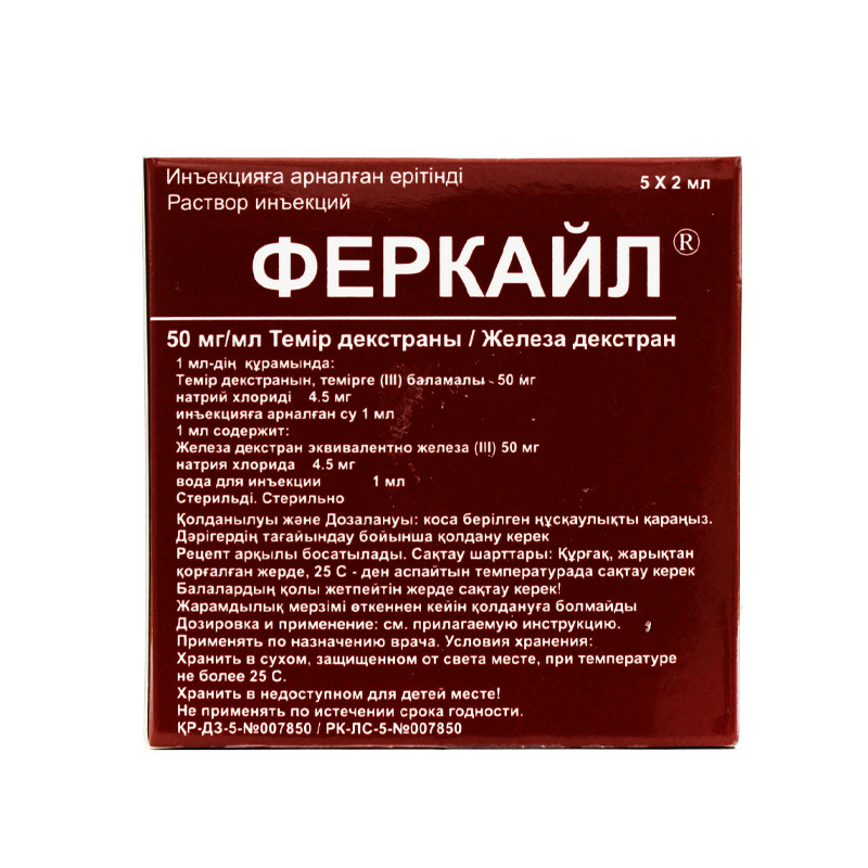 Раствор тёмно-коричневого цвета | Состав+железа декстран 100,00мгжелезо (III) | Противопоказания+- сверхчувствительность к препаратам железа и в случаяхастматических или аллергических состояний в стадии обострения- ревматоидный артрит- острая почечная недостаточность- тяжелая печеночная недостаточность- анемия, не вызванная дефицитом железа (например, гемолитическая анемия)- избыток железа или нарушения его выведения (гемохроматоз,гемосидероз). | Побочные действия+- нежелательные явления и осложнения могут возникнуть у больного при индивидуальной непереносимости и повышенной чувствительности к препаратам железа- редко возможна сверхчувствительность в виде кожной сыпи и зуда- боли в суставах, мышечная боль и жар неизвестного происхождения. Боль может проявиться в период от нескольких часов до нескольких дней после инъекции, которая проходит после назначения болеутоляющих средств. У пациентов с ревматическим артритом может быть ухудшение суставных симптомов- анафилактоидные реакции встречаются крайне редко и могут проявиться в виде затрудненного дыхания и понижением кровяного давления. Симптомы могут появиться через несколько минут после инъекции. В этих случаях прием препарата «Феркайл®» должен быть незамедлительно прекращен. | Способ применения+Взрослым: общая доза, применяемая внутримышечно, должна быть определена в зависимости от массы тела и уровня исходного гемоглобина по следующей формуле: доза (мл) = 0,0476 х Р х (14,8-Н) + 1мл на каждые 5кг массы тела больного (максимально 14 мл), гдеР — масса тела больного, кг14,8 — нормальная концентрация гемоглобинаН — наблюдаемая концентрация гемоглобина (г/100 мл)Эта формула применяется для расчета дозы «Феркайл®» (в мл) для восстановления нормальной концентрации гемоглобина (1-й член уравнения: 0,0476 х Р х (14,8 — Н)) и восстановление запасов железа в организме (2-й член уравнения: 1мл на каждые 5кг массы тела больного максимально 14мл). Число 0,0476 включает содержание железа в «Феркайл®» (50мг/мл), содержание железа в гемоглобине (0,34%) и объем крови (7% массы тела).Детям(с 4 месяцев): для детей весом свыше 15кг назначается доза как для взрослых. Детям весом до 15кг общая доза, применяемая внутримышечно, рассчитывается по следующей формуле: доза (мл) = 0,0476 х Р х (12-Н) + 1мл на каждые 5кг массы тело больного.Общая доза, применяемая из расчета ежедневных инъекций, следующая:- детям весом до 5 кг — 0,5 мл- детям весом от 5 до 10 кг — 1 мл- детям весом свыше 15 кг и взрослым — 2 мл.Для удобства определения курса лечения разработана таблица.Курсовая доза препарата определяется в зависмости от массы тела и уровня исходного гемоглобина в миллилитрах. Количество ампул на курс лечения определяется делением курсовой дозы на 2мл, поскольку в каждой ампуле препарата содержится 2мл раствора. Препарат вводят глубоко внутримышечно один раз в сутки. Перед введением основной дозы препарата, необходимо проведение тест-дозы.КУРСОВАЯ ДОЗА ПРЕПАРАТА «ФЕРКАЙЛ®» В ЗАВИСИМОСТИОТ МАССЫ И УРОВНЯ ИСХОДНОГО ГЕМОГЛОБИНА, В МЛ*НВ (г/100 мл)М (кг) 12,0 11,0 10,0 9,0 8,0 7,0 6,0 5,0 4,0 3,05 1,2 1,5 1,7 2,0 2,2 3,4 4,7 6,0 7,2 8,410 2,5 2,9 3,4 3,9 4,4 4,9 5,4 5,8 6,3 6,815 3,7 4,4 5,1 5,85 6,6 7,3 8,0 8,7 9,4 10,120 4,95 5,9 6,9 7,8 8,8 9,7 10,7 11,6 12,6 13,525 6,2 7,4 8,6 9,8 11,0 12,1 13,3 14,5 15,7 16,930 7,4 8,9 10,3 11,7 13,2 14,6 16,0 17,4 18,9 20,335 8,7 10,3 12,0 13,7 15,4 17,0 18,7 20,4 22,0 23,740 9 12 14 16 17 19 21 23 25 2750 12 15 17 19 21,5 24 26 28 31 3360 15 18 21 24 26,5 29 32 35 38 4170 17 21 24 27 30,5 34 37 40 44 4780 20 23 27 31 35 39 43 46 50 5490 22 27 31 35 39,5 44 48