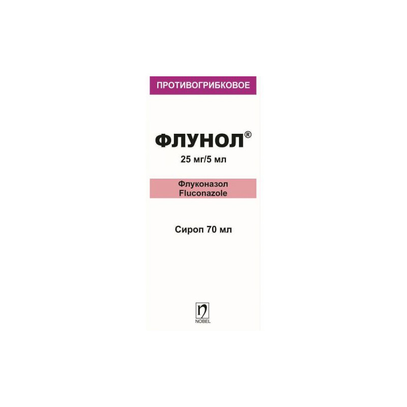 Прозрачный бесцветный сироп cо вкусом апельсина. | Состав+один флакон содержитфлуконазол 350 мг | Противопоказания+- повышенная чувствительность к флуконазолу или производным азола или любым другим компонентам в составе препарата- одновременный прием лекарственных препаратов, удлиняющих интервал QT и метаболизирующихся посредством фермента CYP3A4, такие как астемизол, эритромицин, цизаприд, пимозид, терфенадин- пациенты с редкими наследственными заболеваниями непереносимости галактозы, лактозной недостаточностью или глюкозо-галактозной мальабсорбцией, т.к. препарат содержит сахарозу- беременность и период лактации | Побочные действия+Часто:- головная боль- высыпания на коже- тошнота и рвота, боль в животе, диарея- клинически существенное повышение значений АСТ, АЛТ и щелочной фосфатазыИногда:- утомляемость, беспокойство, астения, гипертермия- конвульсии, головокружение, парестезия, тремор, вертиго- зуд, повышенное потоотделение- анорексия, запор, диспепсия, метеоризм, сухость во рту, изменения вкусовых ощущений- миалгия- бессоница, сонливость- холестаз, повреждение тканей печени, желтуха, клинически существенное повышение общего билирубина- анемияРедко:- эксфолиативные заболевания кожи (синдром Стивенса-Джонсона)- анафилаксия- припадки- алопеция- печеночная недостаточность, гепатит, некроз печени- лейкопения, в т.ч. нейтропения и агранулоцитоз, тромбоцитопения- гиперхолестеринемия, гипертриглицеридемия, гипокалиемияОчень редко:- судороги- многоформная экссудативная эритема- отек Квинке, отек лица и зуд | Способ применения+Препарат Флунол в форме сиропа предназначен для приема внутрь.Суточная доза и режим дозирования препарата рассчитывается исходя из вида и степени тяжести грибковой инфекции. Лечение должно быть продолжено до получения положительных результатов анализа или клинических параметров. Недостаточная длительность лечения может привести к рецидиву активной инфекции.Взрослые:Для лечения криптококкоза рекомендовано применение Флунола в дозе 400 мг (около 5 мг/кг) 1 раз в день. Средняя продолжительность лечения — 6 — 8 недель. Необходимо наблюдение за состоянием пациента в течение 1 года для своевременной диагностики рецидива заболевания. С целью предотвращения рецидива криптококковой инфекции у пациентов с ослабленным иммунитетом Флунол сироп назначают в дозе 200 мг (около 2,5 мг/кг) 1 раз в сутки. ВИЧ-положительным пациентам, а также больным СПИДом рекомендована пожизненная терапия.Для лечения криптококкового менингита рекомендовано применение Флунола в дозе 400 мг (около 5 мг/кг) однократно в первый день лечения, затем по 200 — 400 мг однократно в сутки. Средняя продолжительность лечения составляет 10-12 недель после получения отрицательных результатов культурологического исследования спинномозговой жидкости. Необходимо наблюдение за состоянием пациента в течение 1 года для своевременной диагностики рецидива заболевания. Больным СПИДом рекомендуется принимать по 200 мг Флунола 1 раз в день после завершения основного курса лечения для предотвращения рецидива криптококкового менингита в течение неограниченного периода времени.В случае орофарингеального кандидоза в первый день терапии рекамендуется принимать 200 мг (около 2,5 мг/кг) и в последующие дни по 100 мг (около 1,25 мг/кг) 1 раз в день в течение 2-х недель. Пац