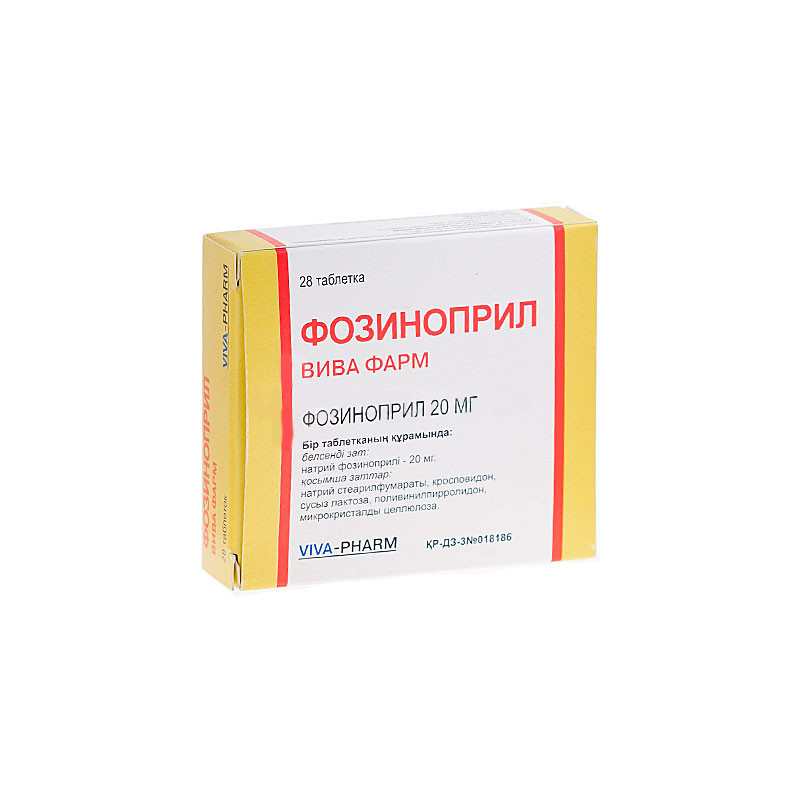 Круглые двояковыпуклые таблетки белого или почти белого цвета, со скошенными краями, с риской на одной стороне. | Состав+Одна таблетки содержитфозиноприл натрия 10 мг или 20 мг | Противопоказания+- повышенная чувствительность к фозиноприлу или любому другому веществу, входящему в состав препарата- наследственный или идиопатический ангионевротический отек, в том числе в анамнезе, после приема других ингибиторов АПФ- беременность (применение ингибиторов АПФ на протяжении второго и третьего триместров беременности вызывает повреждение или даже гибель развивающегося плода)- лактация- детский возраст до 18 лет | Побочные действия+- тошнота, рвота, стоматит, глоссит, анорексия, боль в животе, запор, гепатит, холестатическая желтуха, панкреатит, кишечная непроходимость- сухой кашель, одышка, фарингит, ларингит, синусит, легочные инфильтраты, бронхоспазм, дисфония- снижение АД, ортостатическая гипотензия, тахикардия, сердцебиение, аритмии, инфаркт миокарда- кожная сыпь, зуд, ангионевротический отек- развитие или усугубление симптомов хронической почечной недостаточности, протеинурия, олигурия- гиперкреатининемия, повышение концентрации мочевины, повышение активности «печеночных» трансаминаз, гипербилирубинемия, гиперкалиемия, гипонатриемия; снижение концентрации гемоглобина и гематокрита, нейтропения, лейкопения, эозинофилия, повышение скорости оседания эритроцитов (СОЭ)- инсульт, ишемия головного мозга, головокружение, головная боль, слабость; при использовании в высоких дозах — бессонница, тревожность, депрессия, спутанность сознания, парестезии- нарушения слуха и зрения, шум в ушах, нарушения со стороны вестибулярного аппарата. | Способ применения+Дозировка препарата должна подбираться индивидуально.Артериальная гипертензия:рекомендуемая начальная доза препарата составляет 10 мг один раз в день. Дозу необходимо подбирать в зависимости от динамики снижения артериального давления. Обычная доза составляет от 10 до 40 мг один раз в день. При отсутствии достаточного гипотензивного эффекта возможно дополнительное назначение диуретиков.Если лечение препаратом Фозиноприл ВИВА ФАРМ начинают на фоне проводимой терапии диуретиком, то его начальная доза должна составлять не более 10 мг. Для уменьшения вероятности возникновения гипотензии диуретики следует отменить за 2-3 дня до начала лечения препаратом Фозиноприл ВИВА ФАРМ.Сердечная недостаточность:рекомендованная начальная доза составляет 10 мг один раз в день. В зависимости от терапевтической эффективности дозу можно повышать с недельным интервалом вплоть до максимальной дозы 40 мг один раз в день. Фозиноприл ВИВА ФАРМ рекомендуется применять в комбинации с диуретиком.Артериальная гипертензия и сердечная недостаточность при нарушенной функции почек или печениПоскольку выведение препарата из организма происходит двумя путями, снижения доз больным с нарушенной функцией почек или печени обычно не требуется.Гериатрические больныеРазличий в эффективности и безопасности лечения препаратом больных в возрасте 65 лет и старше и молодых больных не наблюдается. Однако, нельзя исключить большую восприимчивость больных старшего возраста к препарату. | Показания к применению+- артериальная гипертензия (можно применять как для монотерапии, так и в комбинации с другими антигип