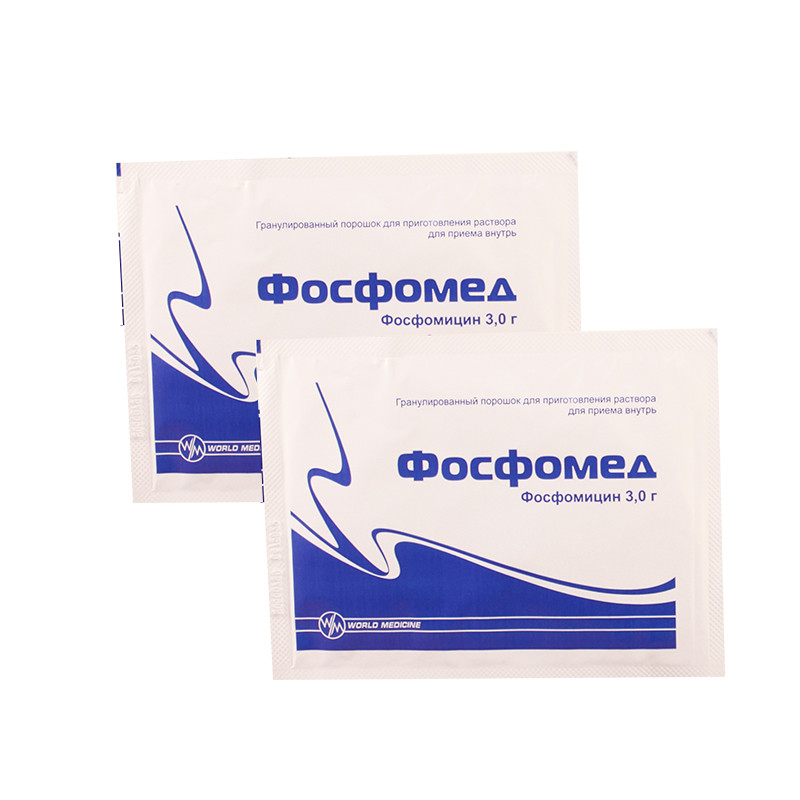 Однородный гранулированный порошок белого или почти белого цвета с апельсиново-мандариновым запахом. | Состав+1 саше-пакет содержит:фосфомицина трометамола5,631 г (эквивалентно 3,0 гфосфомицина) | Противопоказания+- Повышенная чувствительность к какому-либо компоненту препарата- тяжелая почечная недостаточность (клиренс креатинина‹ 10 мл/мин)- гемодиализ- детский возраст до 12 лет | Побочные действия+- Часто (› 1/100 до ‹ 1/10)- — вульвовагинит- — головная боль, головокружение- — диарея, тошнота, диспепсия- Редко (› 1/1000 до ‹1/100)- — тахикардия- — парестезии- — боль в животе, рвота- — сыпь, крапивница, зуд- — астения- Не известно- — анафилактический шок, аллергические реакции- — гипотония- — астма- — отек Квинке- — псевдомембранозный колит | Способ применения+Взрослым назначают по 1 пакетику (3 г) 1 раз в день.Гранулы растворяют в 1/3 стакана воды. Препарат принимаютвнутрь 1 раз в сутки натощак за 2 часа до или после еды, предпочтительно перед сном, предварительно опорожнив мочевой пузырь.Курс лечения составляет 1 день. В более тяжелых случаях (пожилые пациенты, рецидивирующие инфекции) принимают еще 1 пакетик через 24 часа.С целью профилактики инфицирования мочевыводящих путей при хирургическом вмешательстве и трансуретральных диагностических процедурах принимают по 1 пакетику Фосфомеда за 3 часа до и через 24 часа после вмешательства.Назначается девочкам-подросткам с 12 лет в дозе 3 г. однократно.При почечной недостаточности уменьшают дозу и удлиняют интервалы между приемами. | Показания к применению+Фосфомед применяется для леченияследующихинфекций, вызванныхпатогеннымимикроорганизмами, чувствительными к фосфомицину:- острые и неосложненные инфекции мочевыводящих путей- бессимптомная бактериурия- профилактика инфекции мочевыводящих путей при проведении хирургических вмешательств и диагностических исследовании на нижних отделах мочевыводящих путей (например, ТУР) | МНН: ФосфомицинОбъем: