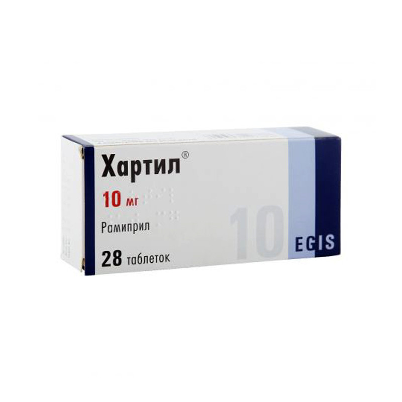 Таблетки 2,5 мг: желтые или светло-желтые, возможно с мраморной поверхностью, плоские овальные, с фаской, с риской и гравировкой R2 на одной стороне таблетки, и рисками на боковых поверхностях.Таблетки 5 мг: светло-розовые или оранжево-розовые, возможно с мраморной поверхностью плоские овальные, с фаской, с риской и гравировкой R3 на одной стороне таблетки, и рисками на боковых поверхностях.Таблетки 10 мг: белые или почти белые плоские овальные, с фаской, с риской и гравировкой R4 на одной стороне таблетки, и рисками на боковых поверхностях. | Состав+Одна таблетка содержит — рамиприл 2,5мг, 5мг, 10мг, | Противопоказания+- повышенная чувствительность к рамиприлу или другому компонентупрепарата- ангионевротический отек в анамнезе- гемодинамически значимый двусторонний (или односторонний у пациентов содной почкой) стеноз почечной артерии- артериальная гипотензия или нестабильная гемодинамика- гипертензия, обусловленная первичным гиперальдостеронизмом- экстренный гемодиализ или гемофильтрация с использованиемвысокопроницаемых диализных мембран- аферез ЛПНП сульфатом декстрана- одновременный прием препарата Хартил с десенсибилизирующей терапиейядом перепончатокрылых- беременность и лактацияСуществует лишь ограниченный опыт применения рамиприла у детей, у больных с тяжелой почечной недостаточностью (КК менее 20 мл/мин/1,73м2 поверхности тела) и у больных во время диализа. | Побочные действия+- головокружение, головная боль, слабость- сонливость, нервная возбудимость, беспокойство, нарушения настроения- бессонница, тревожность, спутанность сознания, парестезии, тремор,обмороки (при применении в высоких дозах)- снижение артериального давления, ортостатическая гипотензия- нарушение кровоснабжения органов, связанное со стенозом сосудов- ухудшение функции почек, а в некоторых случаях угрожающая жизнипочечная недостаточность, особенно при: поражении сосудов почек (сгемодинамическими признаками стеноза почечной артерии); присостоянии после трансплантации почки; при выраженном сниженииартериального давления, в основном у больных с сердечнойнедостаточностью- усиление существующей протеинурии, однако, выделение белка почкамиможет также снижаться, особенно при диабетической нефропатии- уменьшение объема мочи (в начале приема препарата)- вестибулярные нарушения, нарушение слуха и зрения, шум в ушах- сухость во рту, повышенная чувствительность или воспаление слизистойоболочки полости рта, нарушение (металлический вкус) или потеря вкусовыхощущений- снижение аппетита, расстройство пищеварения, запор, диарея, тошнота, рвота,неприятные ощущения в эпигастральной области, панкреатит- сухой кашель, бронхоспазм (у пациентов с повышенной возбудимостьюкашлевого рефлекса)- ринит, синусит, бронхит- ангионевротический отек языка, глотки и гортани- отеки (неангионевротической природы) в основном на голенях- прилив крови с ощущением жара на отдельных участках кожи- конъюнктивит- потоотделение, кожный зуд, уртикарные элементы, макуло-папулярная илихеноидная экзантема и энантема, многоморфная эритема, псориазо- ипузырчаткоподобная экзантема и энантема, аллопеция- обострение синдрома Рейно, васкулит- фотосенсибилизация- онихолиз (разрушение ногтей)- мышечный спазм, миалгии, артралгии, лихорадка- снижение числа эритроцитов и гемоглобина (ино