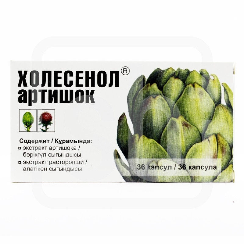 Состав+Состав (1 капсула, 0,4 г):Cynavae scomuli foliae extract(экстракт листьев артишока)……………0,38 гSrlybi maran fructuum exlracl(экстракт расторопши пятнистой)…….0,01 г | Противопоказания+Индивидуальная непереносимость компонентов БАД, беременность, кормление грудью. Перед применением БАД необходимо проконсультироваться с врачем | Способ применения+Взрослым по 1 капсуле в день во время еды на протежение 4-5 недель | Показания к применению+Рекомендуется в качестве биологически активной добавки к пище.Печень является главным фильтром в организме. При зашлакованности печени продукты распада начинают откладываться в здоровых тканях, суставов, кожи, сосудов и т.д., вызывая болезнь. Поэтому зачастую, когда лечится печень, перестают болеть суставы. Печень — это орган с огромными резервными возможностями, поэтому любые поражения печени — от обычной зашлакованности до серьезных болезней, длительно протекают бессимптомно.В состав препаратов линии «Холесенол®» входят компоненты природного происхождения, содержащие важнейшие для здоровья органов пищеварения и защиты печени вещества. «Холесенол® Артишок» (капсулы) и «Холесенол®» (сироп) содержат активные ингредиенты, способствующие процессам нормапизацт функционального состояния печени и желчевыводящих путей. Проявите заботу о своем здоровье!Показания к применениютоксические повреждения печени (алкого-интоксикация соединениями тяжелыхметаллов, лекарственные поражения печени)хронический гепатит, цирроз печени (в со-комплексной терапии и их профилактики)состояния после инфекционного и токсического гепатитов, дистрофия и жировая инфильтрацияпеченикоррекция нарушений лепидного обмена | Объем: