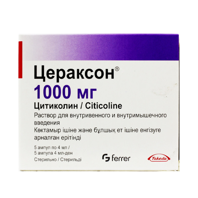Раствор для внутривенного и внутримышечного введения — прозрачная бесцветная жидкость. | Состав+4 мл раствора для внутривенного и внутримышечного введения содержат — цитиколин натрия 522,5 мг (эквивалентно 500 мг цитиколина) или 1045 мг (эквивалентно 1000 мг цитиколина),100 мл раствора для приема внутрь содержат- цитиколин натрия 10,450 г (эквивалентно 10,0 г цитиколина) | Противопоказания+Повышенная чувствительность к препарату. | Побочные действия+- сыпь, зуд кожи, возможно развитие шока- бессонница, головная боль, головокружение, возбуждение, тремор- тошнота, снижение аппетита, изменение показателей функции печени- повышение температуры, чувство жара- повышение или кратковременное понижение артериального давления | Способ применения+Внутривенно назначают в форме медленной внутривенной инъекции (в течение 5 минут) или капельного внутривенного вливания (40-60 капель в минуту).Лечение начинают с внутривенного введения препарата в дозировке 500 — 1000 мг (в зависимости от тяжести заболевания) 1- 2 раза в сутки в течение двух недель. Затем по 500 — 1000 мг внутримышечно 1- 2 раза в сутки в течение четырех недель с последующим переходом на пероральную форму. | Показания к применению+- черепно-мозговые травмы- нарушения сознания различной этиологии- ишемический и геморрагический инсульт- когнитивные, чувствительные и двигательные неврологические расстройства, вызванные дегенеративными изменениями и сосудистыми нарушениями- дегенеративные или инволюционные мозговые психоорганические синдромы и последствия цереброваскулярной недостаточности (первичные и вторичные нарушения мыслительной функции у лиц пожилого возраста, характеризующиеся нарушениями памяти, спутанностью сознания, дезориентацией, снижением способности концентрации)- эмоциональная нестабильность, раздражительность, снижение интереса- старческая псевдомеланхолия- острый панкреатит или обострение хронического панкреатита- послеоперационный панкреатит (совместно с ингибиторами протеолитических ферментов)- паркинсонизм (совместно с холиноблокаторами) | МНН: ЦитиколинОбъем: 1000 мг/4 млАртикул: A02-0000112