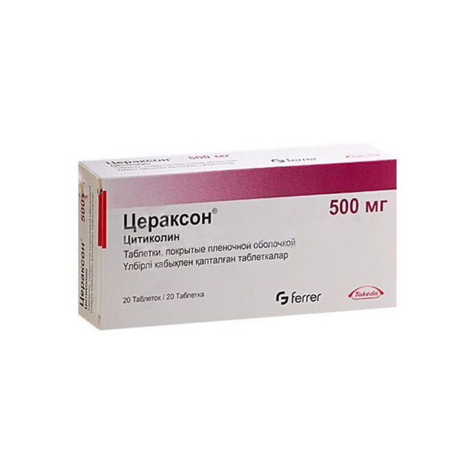 Белого цвета, продолговатая таблетка, покрытая плёночной оболочкой, с оттиском «С500». | Состав+Одна таблетка содержит — цитиколин натрия 522,5 мг (эквивалентно 500 мгцитиколина), | Противопоказания+повышенная чувствительность к компонентам препаратане следует назначать больным с высоким тонусом парасимпатической нервной системытаблетки не назначают детям в возрасте до 6 лет | Побочные действия+Очень редко (‹1/10,000) (включая индивидуальные реакции).- галлюцинации- цефалия, вертиго- артериальная гипертензия, артриальная гипотензия- диспноэ- тошнота, рвота, нарушение стула- покраснение, крапивница, экзантема- лихорадка, отек | Способ применения+ВзрослыеРекомендованная дозировка от 500 до 2000 мг в день (1 — 4 таблетки), в зависимости от тяжести заболевания.Доза может быть изменена по рекомендации врача.Люди пожилого возрастаНе требуется корректировка дозировки для данной возрастной группы. | Показания к применению+инсульт и ее последствиячерепно-мозговая травма и ее последствиякогнитивные, чувствительные и двигательные неврологические расстройства, вызванные дегенеративными изменениями и сосудистыми нарушениями | МНН: ЦитиколинОбъем: 500 мгАртикул: A02-0000102