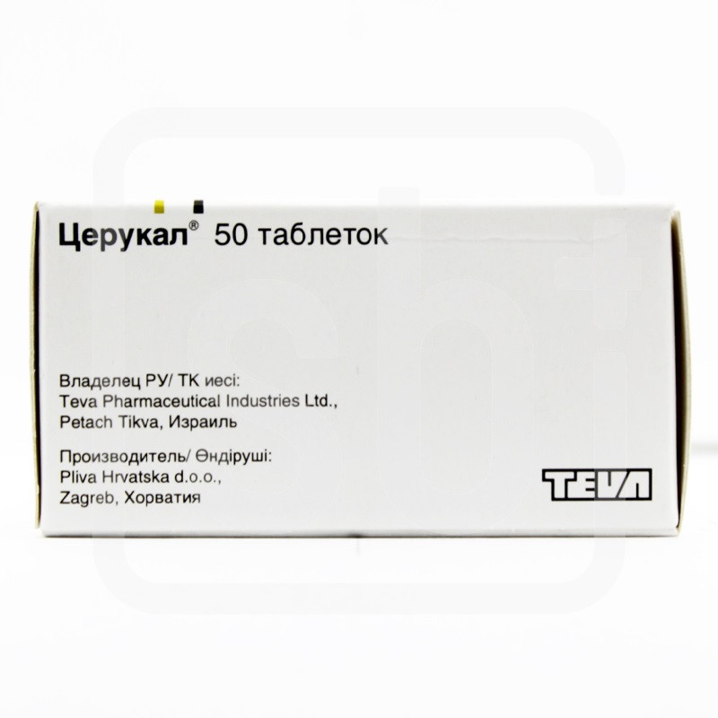 Белые, круглые, плоские таблетки с линией разлома на одной стороне | Состав+Одна таблетка содержит- метоклопрамида гидрохлорид 10 мг, | Противопоказания+- глаукома- феохромоцитома- пролактинзависимые опухоли- механическая кишечная непроходимость- желудочно-кишечные кровотечения, перфорация кишечника- эпилепсия- экстрапирамидные расстройства, паркинсонизм- первый триместр беременности и период кормления грудью- детский возраст до 3 лет- повышенная чувствительность к метоклопрамиду- повышенная чувствительность к натрию сульфиту, особенно у больных с бронхиальной астмой и другими аллергическими заболеваниями. | Побочные действия+- чувство усталости, головная боль, головокружение, страх, беспокойство,депрессии- диарея, запор, сухость во рту- гиперкинезы, спазм лицевой мускулатуры, спастическая кривошея- редко, главным образом, у детей — развитие дискинезий- у пациентов пожилого возраста после длительного приема высоких доз возможны поздние дискинезии, акатизия, паркинсонизм- агранулоцитоз- в случаях длительного применения препарата: гинекомастия, галакторея (в результате повышения уровня пролактина), нарушения менструального цикла, отеки.При развитии этих явлений метоклопрамид отменяют. | Способ применения+Церукал принимают внутрь за 30 минут до еды.Взрослые и подростки от 14 лет и старше: по 10 мг 3-4 раза в день. Максимальная разовая доза составляет 10 мг, максимальная суточная доза — 40 мг.Дети в возрасте от 3 до 14 лет: максимальная разовая доза составляет0,1 мг/кг веса тела, максимальная суточная доза составляет 0,5 мг/кг веса тела. Препарат назначают только по строгим жизненным показаниям.Длительность курса лечения определяется врачом, обычно составляет 4- 6 недель. В отдельных случаях лечение можно продолжать до 6 месяцев: химио-индуцированная рвота при лечении больных противоопухолевыми препаратами.Пациентам с нарушениями функции почек требуется корректировка режима дозирования в соответствии с клиренсом креатинина.Клиренс креатинина Доза метоклопрамидадо 10 мл/мин. 10 мг 1 раз в деньот 11 до 60 мл/мин. 5 мг 1 раз в день | Показания к применению+- позывы к рвоте и рвота различного генеза- атония и гипотония желудка и кишечника (в том числе послеоперационная)- дискинезия желчевыводящих путей, рефлюкс-эзофагит, функциональный стеноз привратника- парез желудка при сахарном диабете- рентгенологическое исследование желудка и тонкой кишки (с целью ускорения пассажа контрастного вещества)- введение кишечного зонда. | МНН: МетоклопрамидОбъем: 10 мгАртикул: A02-0001242