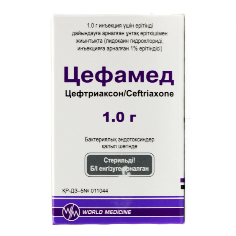 Кристаллический порошок, от белого до желтовато-оранжевого цвета для инъекций в бесцветном стеклянном флаконе. Растворитель: бесцветная жидкость в ампуле темного стекла. | Состав+цефтриаксон (в форме натриевой соли) 0,5 г или 1,0 г,1 ампула растворителя содержит (для формы выпуска в комплекте с растворителем) — лидокаин гидрохлорида 20 мг или 35 мг,2 мл или до 3,5 мл. | Противопоказания+- Повышенная чувствительность к цефалоспоринам и пенициллинам- Первый триместр беременности- Гипербилирубинемия у новорождённых, недоношенные дети- Почечная/печёночная недостаточность- Неспецифический язвенный колит, энтерит или колит, связанный с применением антибактериальных препаратов- Наличие в анамнезе кровотечений. | Побочные действия+Цефамед в большинстве случаев хорошо переносится. Побочные эффекты, как правило, обратимы и исчезают после отмены препарата.- возможны: диарея, тошнота, рвота, стоматит, глоссит, эозинофилия, лейкопения, гранулоцитопения, гемолитическая анемия, тромбоцитопения, экзантема, аллергический дерматит, зуд, крапивница, анафилактический шок, мультиформная эритема- редко: головная боль, головокружение, повышение активности печеночных трансаминаз, олигурия, повышение содержания креатинина в сыворотке крови- в единичных случаях: псевдомембранозный колит, нарушение свертывания крови, при внутривенном введении болезненность по ходу вены, флебит- аритмии (при быстром введении)- кровотечения- дисбактериоз, кандидоз. | Способ применения+Цефамед вводят внутримышечно и внутривенно струйно или капельно.Обычные дозы для взрослых и детей в возрасте 12 лет и старше составляют 1-2 г Цефамеда один раз в сутки. Интервал между введениями — 24 часа. В тяжелых случаях или при инфекциях, вызванных умеренно чувствительными бактериями, суточная доза препарата может быть увеличена до 4 г.Новорожденным (до двухнедельного возраста) Цефамед назначают в дозе 20-50 мг/кг массы тела один раз в сутки. Превышение дозы недопустимо из-за незрелости ферментной системы у новорожденных.Для грудных детей и детей в возрасте до 12 лет суточная доза Цефамеда составляет 20-80 мг/кг массы тела один раз в сутки. У детей c массой тела 50 кг и более применяют обычные дозы для взрослых.Внутривенное введение препарата в дозе более 50 мг/кг массы тела должно проводиться капельно в течение не менее 30 минут.Длительность лечения зависит от характера и тяжести заболевания. Введение Цефамеда рекомендуется продолжить не менее чем в течение 3 дней после нормализации температуры тела.При бактериальном менингите новорожденным и детям препарат назначают в начальной дозе 100 мг/кг массы тела один раз в сутки. Максимальная суточная доза — 4 г. После идентификации возбудителя, доза может быть уменьшена.При лечении гонококковой инфекции нижних отделов мочевыделительной системы без осложнений рекомендуемая доза составляет 250 мг Цефамеда однократно внутримышечно.При лечении гоноккоковой инфекции нижних отделов мочевыделительной системы с осложнениями, верхних отделов и органов малого таза (лечение больных следует осуществлять в стационарных условиях). Тактика терапии зависит от характера клинического течения гонореи. Так, при абсцедировании парауретральных и больших вестибулярных желез наряду с противомикробными препаратами, эффективными в отношении N. gonorrhoeae, необходимо исп