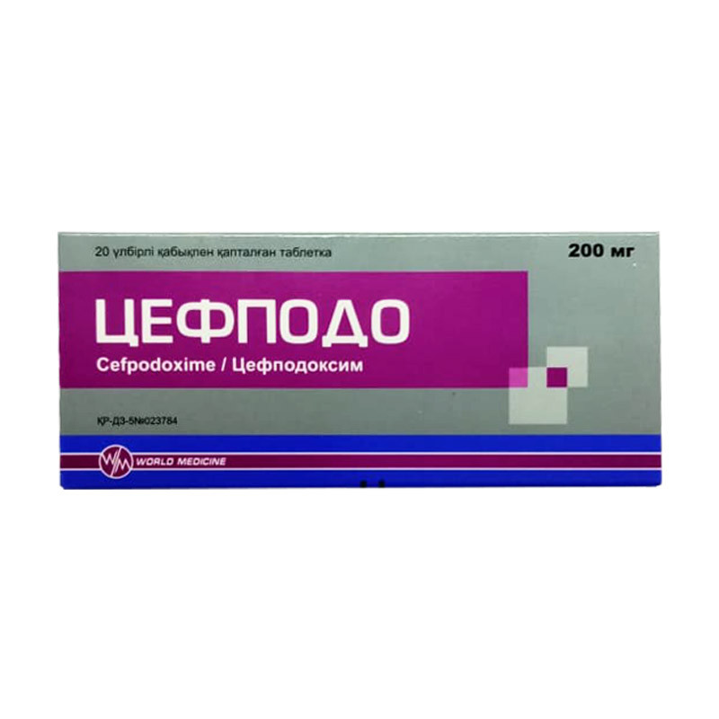 Таблетки круглой формы, с двояковыпуклой поверхностью, покрытые пленочной оболочкой белого цвета, с риской на одной стороне. | Состав+Одна таблетка содержитцефподоксим (в виде цефподоксима проксетила 260,88 мг) 200 мг | Противопоказания+- Непереносимость к цефподоксиму и другим компонентам препарата;- аллергические реакции (анафилаксии) к пенициллину или другимбета-лактамным антибиотикам;- период лактации;- лицам с наследственной непереносимостью фруктозы, дефицитом фермента Lapp-лактазы, мальабсорбцией глюкозы-галактозы | Побочные действия+Использованные ниже параметры частоты побочных эффектов определены следующим образом: часто (от больше или равно 1/100 до ‹ 1/10), нечасто (от больше или равно 1/1000 до ‹ 1/100), редко (от больше или равно 1/10000 до ‹ 1/1000), неуточненной частоты — параметры частоты не могут быть оценены по имеющимся данным.Со стороны пищеварительной системы: часто — тошнота, персистирующая диарея; нечасто — рвота, боль в животе; неуточненной частоты — псевдомембранозный колит, задержка стула, гастрит, дисбактериоз (рост Clostridium difficile), слюнотечение, метеоризм, снижение аппетита.Со стороны нервной системы: нечасто — головокружение, головные боли, повышенная утомляемость; неуточненной частоты — раздражительность, бессонница, «кошмарные» сновидения.Со стороны дыхательной системы: неуточненной частоты — кашель.Со стороны сердечно-сосудистой системы: неуточненной частоты — снижение артериального давления.Со стороны органов кроветворения: редко — тромбоцитопения; неуточненной частоты — нейтропения, тромбоцитоз, лейкоцитоз, лейкопения, лимфоцитоз, гранулоцитоз, базофилия, моноцитоз, лимфоцитопения, носовое кровотечение.Со стороны мочеполовой системы: неуточненной частоты — нарушение менструального цикла.Со стороны иммунной системы: нечасто — кожная сыпь, крапивница; неуточненной частоты — зуд, эозинофилия, ангионевротический отек, лихорадка, анафилактический шок.Лабораторные показатели: редко — гипербилирубинемия; неуточненной частоты — повышение активности «печеночных» трансаминаз и щелочной фосфатазы, лактатдегидрогеназы, гамма-глутамилтрансферазы, повышение концентрации мочевины, креатинина, гипер- или гипогликемия, гипопротеинемия и гипоальбуминемия, снижение гемоглобина, положительная реакция Кумбса, увеличение протромбинового времени.Прочие: редко — слабость; неуточненной частоты — боль в груди, повышенное потоотделение. | Способ применения+ЦЕФПОДО показан для приема внутрь во время еды.В следующей таблице представлены рекомендованные дозы, длительность лечения, контингент пациентов (от 12 лет и старше), кроме других указаний врача:Взрослые и подростки от 12 лет и старшеИнфекция Общая Режим Длительностьсуточная доза дозирования леченияИнфекции верхних Синусит: 400 мг Синусит: по 200 мг 5-10 днейдыхательных путей, Другие инфекции через каждыевызванных Streptococcus верхних дыха 12 часовpneumoniae, Streptococcus тельных Другие инфекцииpyogenes, Haemophilus путей: 200 мг верхних дыха-influenzae или Moraxella тельных путей:(Branhamella) catarrhalis, по 100 мг (1/2 таб-включая синусит, летки) черезтонзиллит и фарингит каждые 12 часовВнебольничная 400 мг по 200 мг через 14 днейпневмония, вызванная каждые 12 часовS. pneumoniae илиH. influenzaeОбострение хронического 400 мг по 200 мг через 10 днейбактериального бронхита, каждые 12 часоввызванное S. pneumoniae,H. influenzae илиM. catarrhalisДля паци