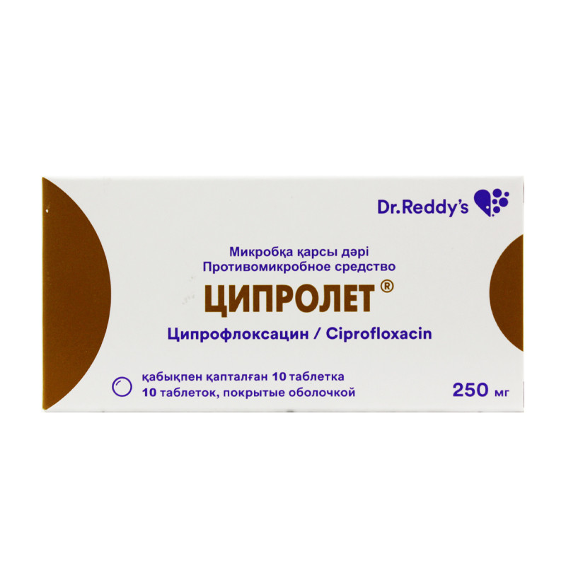 Состав+1 таблетка покрытая оболочкой содержит ципрофлоксацина | Противопоказания+Повышенная чувствительность к любому из компонентов лекарственного препарата.Беременность и кормление грудью. | Побочные действия+Побочные действия и реакции Ципрофлоксацин должен применяться с осторожностью у больных с эпилепсией, с заболеваниями ЦНС и назначаться только в том случае, если результат лечения превышает риск развития побочных эффектов со стороны ЦНС.Кристаллурия была связана с применением ципрофлоксацина. Для лучшей переносимости препарата необходимо избегать ощелачивания мочи.У больных, имеющих в анамнезе дефицит глюкозы-6-фосфат дегидрогеназы возможно развитие гемолитических реакций при взаимодействии с хинолонами, поэтому ципрофлоксацин должен применяться с осторожностью у этих пациентов.Воспаление сухожилий и разрыв могут наблюдаться при применении антибактериальных препаратов группы хинолонов. Такие реакции преимущественно наблюдались у пациентов старшего возраста, которые одновременно применяли кортикостероиды. При первых признаках боли или воспаления больные должны прекратить прием ципрофлоксацина и не давать нагрузку.Серьезные и иногда с летальным исходом анафилактические реакции наблюдались у пациентов, получающих хинолоны. Применение ципрофлоксацина должно быть прекращено при первых признаках появления сыпи на кожных покровах или при появлении первых признаков аллергической реакции.Псевдомембранозный дисбактериоз наблюдался практически всегда при терапии с применением антибактериальных препаратов любой группы, включая ципрофлоксацин, и может быть от легкой до крайне тяжелой степени тяжести, угрожающей жизни.Появление ожогов от легкой до тяжелой степени тяжести, как проявление повышенной реакции фоточувствительности, наблюдалось у пациентов, подвергшихся воздействию прямых солнечных лучей при приеме некоторых препаратов хинолонового ряда. Поэтому необходимо избегать попадания прямых солнечных лучей.Ципрофлоксацин обычно хорошо переносится. Хотя не установлена прямая связь развития побочных эффектов от приема ципрофлоксацина, но наиболее часто встречающиеся побочные реакции были: тошнота, диарея, рвота, боли в животе, чувство беспокойства, кожная сыпь.Другие неблагоприятные реакции, которые наблюдались при применении ципрофлоксацина менее чем у 1 % пациентов, включают:Со стороны желудочно-кишечного тракта:язвы ротовой полости, кандидоз полости рта, дисфагия, кишечная перфорация, желудочно-кишечное кровотечение и холестатическая желтуха.Со стороны ЦНС:депрессия, головокружение, бессонница, раздражительность, атаксия, сотрясение, конвульсии, слабость, галлюцинации, анорексия и парестезии.Гиперчувствительность: сыпь, зуд, крапивница, повышенная свето-чувствительность, лихорадка, дрожь, анафилактические/анафилактоидные реакции, включая ангиоотек, отек шеи, губ, рук, кожный кандидоз, повышенная пигментация и редко эритема.Со стороны мочевыводящих путей:почечная недостаточность, полиурия, интерстициальный нефрит, ацидоз, кровотечение из мочевыводящих путей, задержка мочи и вагинит.Со стороны опорно-двигательного аппарата:артралгия, боли в пояснице, скованность в суставах, недомогание, боли в шейном или грудном отделе и приступ подагры.Со стороны органов дыхания:диспноэ, л