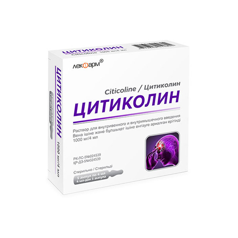 Прозрачный раствор, бесцветный или слегка желтоватого цвета. | Состав+Одна ампула содержит (для дозировок 500 мг/4 мл и 1000 мг/4 мл)цитиколин (в виде цитиколина натрия) 500.00 мг (522.52 мг) или 1000.00 мг (1045.00 мг) | Противопоказания+- Повышенная чувствительность к компонентам препарата- состояние с высоким тонусом парасимпатической нервной системы (ваготония). | Побочные действия+Очень редко (встречаются у более 0.001%, но менее 0.01% пациентов):- галлюцинации- головная боль, головокружение- артериальная гипертензия, артериальная гипотензия- тошнота, рвота, диарея- гиперемия, крапивница, сыпь, пурпура- одышка- озноб, отек.Возможны местные явления в месте введения.При появлении перечисленных побочных реакций или реакции, не упомянутой в инструкции по медицинскому применению, необходимо обратиться к врачу.При возникновении нежелательных лекарственных реакций обращаться к медицинскому работнику, фармацевтическому работнику или напрямую в информационную базу данных по нежелательным реакциям (действиям) на лекарственные препараты, включая сообщения о неэффективности лекарственных препаратовРГП на ПХВ «Национальный Центр экспертизы лекарственных средств и медицинских изделий» Комитет контроля качества и безопасности товаров и услуг Министерства здравоохранения Республики Казахстан http://www.ndda.kz | Способ применения+Режим дозированияРекомендуемая доза составляет от 500 мг до 2000 мг в сутки.Доза зависит от тяжести симптомов заболевания.Метод и путь введенияЛекарственное средство может вводиться внутримышечно, внутривенно медленно (от 3 до 5 минут в зависимости от вводимой дозы) или внутривенно капельно (скорость введения 40-60 капель в минуту).Внутривенный путь введения предпочтительнее, чем внутримышечный. При внутримышечном введении следует избегать повторного введения лекарственного средства в одно и то же место.Длительность леченияДлительность лечения зависит от тяжести симптомов заболевания.Меры, которые необходимо принять в случае передозировкиВ связи с низкой токсичностью лекарственного средства случаи передозировки не описаны.В случае передозировки показана симптоматическая терапия.Необходимые меры предосторожности при примененииПри внутривенном применении введение лекарственного средства должно осуществляться медленно (от 3 до 5 минут в зависимости от вводимой дозы).При внутривенном капельном введении скорость введения лекарственного средства должна быть 40-60 капель в минуту.В случае продолжающегося внутричерепного кровотечения не следует превышать суточную дозу 1000 мг, которую необходимо вводить внутривенно очень медленно (скорость введения 30 капель в минуту).Раствор для внутривенного и внутримышечного введения предназначен только для однократного использования. Введение лекарственного средства должно осуществляться непосредственно после вскрытия ампулы. Неиспользованные остатки содержимого ампулы должны быть уничтожены.Цитиколин совместим с изотоническим внутривенным физиологическим раствором и раствором глюкозы. | Показания к применению+В составе комплексной терапии пациентов со следующей патологией:- острый и восстановительный период ишемического и геморрагического инсульта- черепно-мозговая травма, острый период и последствия травмы | МНН: ЦитиколинОбъем: 1000 мг/4 млАртикул: A02-0027855