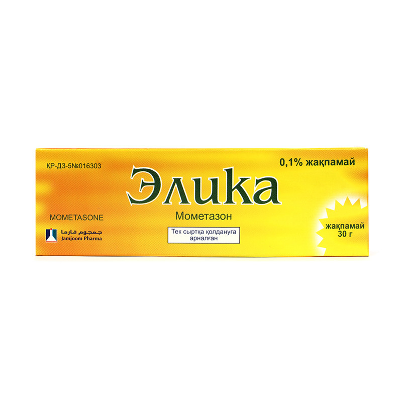 Белого или почти белого цвета мазь, однородная, без посторонних включений. | Состав+1 г мази содержит- мометазона фуроат 1мг, | Противопоказания+- гиперчувствительность к мометазону фуроату и к другим компонентампрепарата, или к кортикостероидам.- розовые угри, периоральный дерматит- бактериальная, вирусная (Herpes simpleх, ветряная оспа, Herpes zoster) илигрибковая инфекция кожи- туберкулез, сифилис- поствакцинальные реакции- детский возраст до 2 лет- беременность и период лактации | Побочные действия+- парастезии, пруритус, ожог, фолликулит, атрофия кожи- воспаление кожных покровов, гипертрихозис, гипопигментация- пероральный дерматит, аллергический контактный дерматит, мацерациякожи, вторичная инфекцияОчень редко- образование папул- надпочечниковая недостаточность и синдром Кушинга (при применениимази в течение длительного времени и/или для лечения больших участковкожи, или с использованием окклюзионных повязок, особенно у детей иподростков) | Способ применения+Элика мазь наносят тонким слоем на пораженный участок один раз в день.Продолжительность курса местного лечения дерматита — от 3 дней до 3 недель.Местное лечение псориаза — 3 дня.Продолжительность курса лечения определяется его эффективностью, а также переносимостью пациентов, наличием и выраженностью побочных эффектов. | Показания к применению+- воспалительные явления и зуд при дерматозах- псориаз, атопический дерматит- себорейный дерматит | МНН: МометазонОбъем: