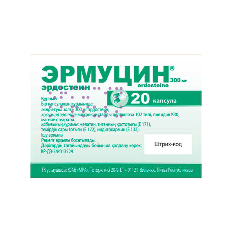 Твёрдые желатиновые капсулы, имеющие корпус жёлтого цвета и крышечку зелёного цвета.Содержимое капсул: порошок от белого до почти белого цвета. | Состав+Одна капсула содержитэрдостеин 300 мг | Противопоказания+- Повышенная чувствительность к действующему или какому-либо из вспомогательных веществ- Активная пептическая язва- Из-за возможного влияния продукта на метаболизм метионина, Эрмуцин противопоказан пациентам, страдающим циррозом печени и дефицитом фермента цистатион-синтетазы- Поскольку нет данных о пациентах с почечной недостаточностью с клиренсом креатинина ‹25 мл/мин или с тяжелой печеночной недостаточностью, использование эрдостеина у этих пациентов не рекомендуется- Детский и подростковый возраст до 18 лет.Необходимые меры предосторожности при примененииПеред применением препарата Эрмуцин® необходимо проконсультироваться с врачом или фармацевтом. | Побочные действия+Как и все лекарственные препараты, это средство может вызвать побочные эффекты, хотя они возникают не у всех пациентов.Сообщаемая частота определяется следующим образом: очень часто (больше или равно 1/10), часто (больше или равно 1/100, ‹1/10), не часто (больше или равно 1/1,000, ‹1/100), редко (больше или равно 1/10,000, ‹1/1,000), очень редко (‹1/10,000), неизвестно (частота не может быть оценена из доступных данных).Нежелательные реакции со стороны желудочно-кишечного тракта могут возникать менее чем 1 пациента из 1000.Очень редко:- Нарушения со стороны нервной системы: головная боль- Нарушения со стороны дыхательной системы, органов грудной клетки и средостения: диспноэ- Нарушения со стороны желудочно-кишечного тракта: дисгевзия (изменение вкусовой чувствительности), тошнота, рвота, диарея, боль в эпигастрии- Нарушения со стороны кожи и подкожных тканей: крапивница, эритема, экземаПри возникновении нежелательных лекарственных реакций обращаться к медицинскому работнику, фармацевтическому работнику или напрямую в информационную базу данных по нежелательным реакциям (действиям) на лекарственные препараты, включая сообщения о неэффективности лекарственных препаратов.РГП на ПХВ «Национальный Центр экспертизы лекарственных средств и медицинских изделий» Комитет контроля качества и безопасности товаров и услуг Министерства здравоохранения Республики Казахстанhttp://www.ndda.kz | Способ применения+Режим дозированияПо 1 капсуле 2 — 3 раза в день, для приема внутрь.Препарат Эрмуцин®, капсулы предназначен для лечения взрослых.Способ примененияПрепарат предназначен для перорального применения.Длительность леченияЭтот лекарственный препарат необходимо применять в точном соответствии с указаниями врача или фармацевта. При возникновении вопросов необходимо проконсультироваться с врачом или фармацевтом. | Показания к применению+Муколитическое, разжижающее средство при острых и хронических заболеваниях дыхательных путей. | МНН: ЭрдостеинОбъем: