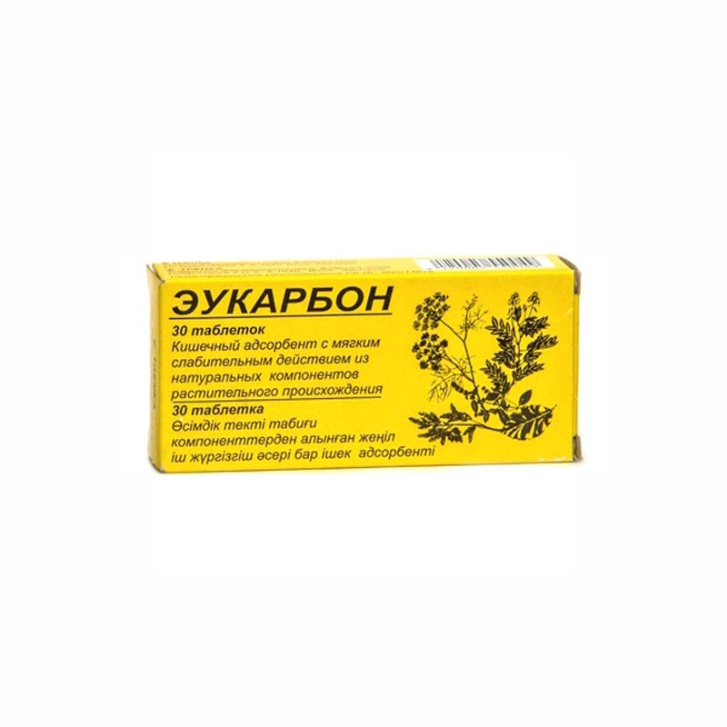 Таблетки серо-черного цвета, цилиндрической формы, с двояковыпуклой поверхностью. | Состав+Одна таблетка содержит:лист сенны 105 мг,ревеня экстракт 25 мг,уголь древесный порошок 180 мг,сера очищенная 50 мг | Противопоказания+- гиперчувствительность к одному из компонентов препарата- язва желудка и двенадцатиперстной кишки- непроходимость кишечника, аппендицит и другие случаи воспалениякишечника- брюшная боль неизвестного происхождения- серьезные нарушения водного и электролитного баланса- дети до 6 лет | Побочные действия+При соблюдении рекомендованной дозы, случаи проявления побочных эффектов крайне редки.- кожная сыпь- крапивница- зуд кожи | Способ применения+Таблетки принимают с большим количеством жидкости во время или после еды. Для взрослых и детей старше 12 лет: по 1-2 таблетки 3 раза в день для достижения легкого слабительного и очищающего эффекта. При необходимости достижения более сильного эффекта, вечерняя доза может быть увеличена до 3-4 таблеток Эукарбон.Для детей 6-х летнего возраста и старше: ? — 1 таблетку во время еды (до 3 раз в день).Для интенсивной очистки и выведения газов из пищеварительного тракта (перед рентгеновским обследованием, пиелоурографией и др.): 6-8 таблеток Эукарбон вечером (после приема препарата рекомендуется обильное питье).Продлжительность лечения определяется индивидуально врачом. | Показания к применению+- гипотония кишечника- запор- процессы брожения и гниения в кишечнике- метеоризм- кишечная аутоинтоксикация- подготовки кишечника к инструментально-диагностическим исследованиям или оперативному вмешательству | Артикул: A01-0001698