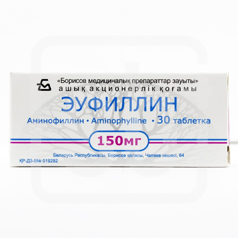 Круглые, плоскоцилиндрические таблетки белого или белого сжелтоватым оттенком цвета, с фаской. | Состав+Одна таблетка содержит- эуфиллина — 150 мг | Противопоказания+гиперчувствительность к компонентам препарата (в т.ч. к др. производным ксантина: кофеин, пентоксифиллин, теобромин),эпилепсияязвенная болезнь желудка и 12-перстной кишки (в стадии обострения)гастрит с повышенной кислотностьюартериальная гипер- или гипотензия тяжелого те-чениятахиаритмиигеморрагический инсульткровоизлияние в сетчатку глаза- детский возраст до 6 летС осторожностьютяжелая коронарная недостаточность (острая фаза инфаркта миокарда, стенокардия)распространенный атеросклероз сосудовгипертрофическая обструктивная кардиомиопатиячастая экстрасистолияповышенная судорожная готовностьпеченочная и/или почечная недостаточностьязвенная болезнь желудка и 12-перстной кишки (в анамнезе)ЖКТ кровотечение в недавнем анамнезенеконтролируемый гипотиреоз (возможность кумуляции) или тиреотоксикоздлительная гипертермиягастроэзофагиальный рефлюксгипертрофия предстательной железы, пожилой воз-раст | Побочные действия+головокружение, головная боль, бессонница, возбуждение, тревож-ность, раздражительность, треморсердцебиение, тахикардия, аритмии, кардиалгия, снижение артериального давления, увеличение частоты приступов сте-нокардиигастралгия, тошнота, рвота, гастроэзофагеальный рефлюкс, изжога,обострение язвенной болезни, диарея, снижение аппетита,кожная сыпь, зудлихорадкаболь в грудитахипноэощущение приливов к лицуальбуминурия, гематурия, гипогликемия,усиление диурезаповышенное потоотделениеПобочные эффекты уменьшаются при снижении дозы препарата. | Способ применения+Внутрь, взрослым следует назначать по 150 мг 1-3 раза в день после еды. Детям внутрь следует назначать из расчета 7-10 мг/кг в сутки в 4 приема. Высшие дозы эуфиллина для взрослых: разовая 0,5 г; суточная — 1,2 г.Высшие дозы для детей: разовая — 7 мг/кг, суточная — 15 мг/кг.Суточная доза не должна превышать 600 мг.Продолжительность лечения определяется врачом. | Показания к применению+бронхиальная астма (препарат выбора у больных с астмой физического напряжения и как дополнительное средство при др. формах)хроническая обструктивная болезнь легких (эмфизема легких,хронический обструктивный бронхит)легочная гипертензия»легочное» сердценочное апноэ | МНН: АминофиллинОбъем: