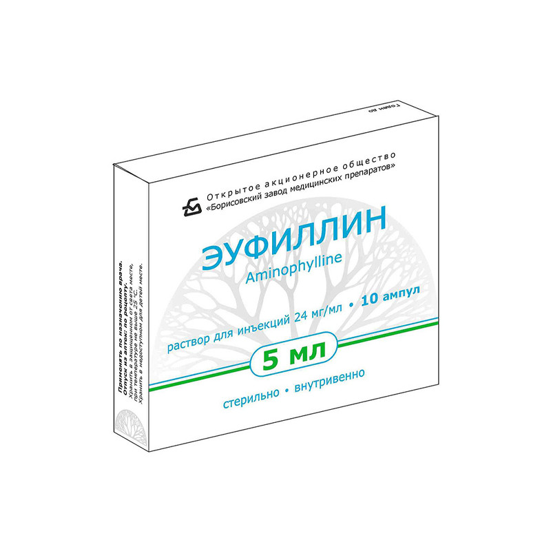 Прозрачная бесцветная или слегка окрашенная жидкость. | Состав+Одна ампула содержит- аминофиллин (эуфиллин) — 240 мг | Противопоказания+- гиперчувствительность (в т.ч. к другим производным ксантина: кофеин, пентоксифиллин, теобромин)- эпилепсия- тяжелая артериальная гипер- или гипотензия- тяжелые тахиаритмии- геморрагический инсульт- кровоизлияние в сетчатку глаза-детский возраст до 14 лет | Побочные действия+Часто- головокружение, головная боль, бессонница, возбуждение, тревожность, раздражительность, тремор, повышенное потоотделениеРедко- тошнота, рвота, гастроэзофагеальный рефлюкс, изжога, обострение язвенной болезни, диарея, при длительном приеме — снижение аппетита- кожная сыпь, зуд кожи, лихорадка, ощущение приливов к лицу- гипогликемия, усиление диурезаОчень редко- тахикардия (в т.ч. у плода во время приема препарата беременной в III триместре), аритмии, снижение артериального давления, кардиалгия, увеличение частоты приступов стенокардии, боль в груди, тахипноэ, альбуминурия, гематурияПобочные эффекты уменьшаются при снижении дозы препарата.Местные реакции: уплотнение, гиперемия, болезненность в месте введения. | Способ применения+Взрослым:вводят внутривенно медленно (в течение 4-6 минут) по 5-10 мл 24 мг/мл раствора (0,12- 0,24 г), который предварительно разводят в 10-20 мл изотонического раствора натрия хлорида. При появлении сердцебиения, головокружения, тошноты скорость введения замедляют или переходят на капельное введение, для чего 10-20 мл 24 мг/мл раствора (0,24-0,48 г) разводят в 100-150 мл изотонического раствора натрия хлорида; вводят со скоростью 30-50 капель в минуту.Парентерально вводят эуфиллин до 3 раз в сутки, не более 14 дней.Высшие дозы эуфиллина для взрослых: разовая — 0,25 г, суточная — 0,5 г.При неотложных состояниях взрослым вводят внутривенно в дозе 6 мг/кг, разводят в 10- 20 мл 0,9% раствора NаСI, вводят медленно в течение не менее 5 мин. При астматическом статусе показано в/в капельное введение — 720-750 мг | Показания к применению+- астматический статус (дополнительная терапия)- нарушение мозгового кровообращения по ишемическому типу (в составе комбинированной терапии)- левожелудочковая недостаточность с бронхоспазмом и нарушением дыхания по типу Чейн-Стокса- отечный синдром почечного генеза (в составе комплексной терапии) | МНН: АминофиллинОбъем: 2,4 %Артикул: A02-0002069